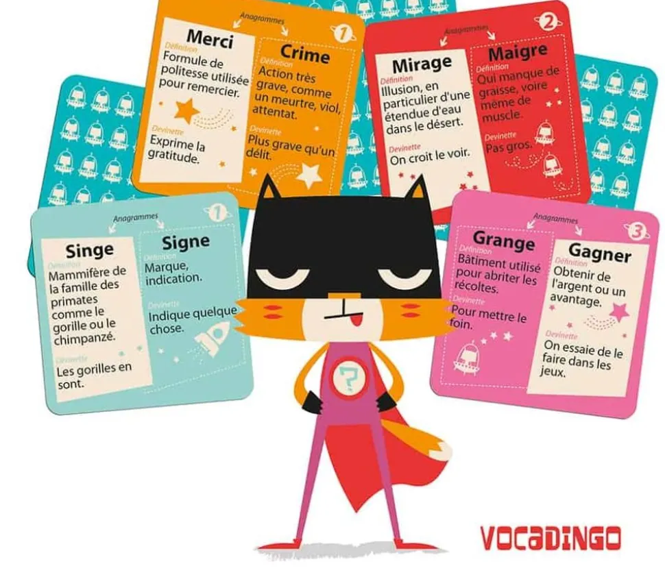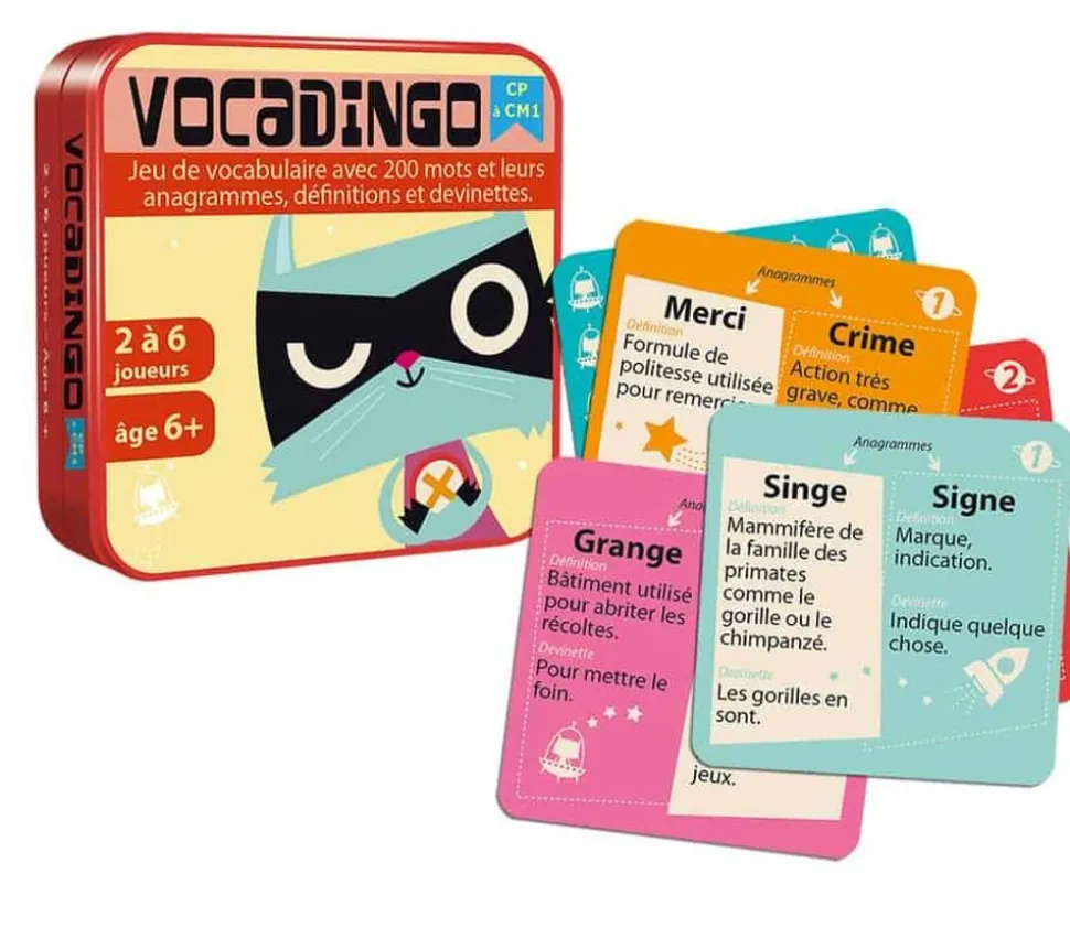 Vocadingo. Jeux de cartes éducatifs pour travailler le vocabulaire et l’orthographe en classe du CP au CM1 de façon amusante. Age environ de 6 à 10 ans.