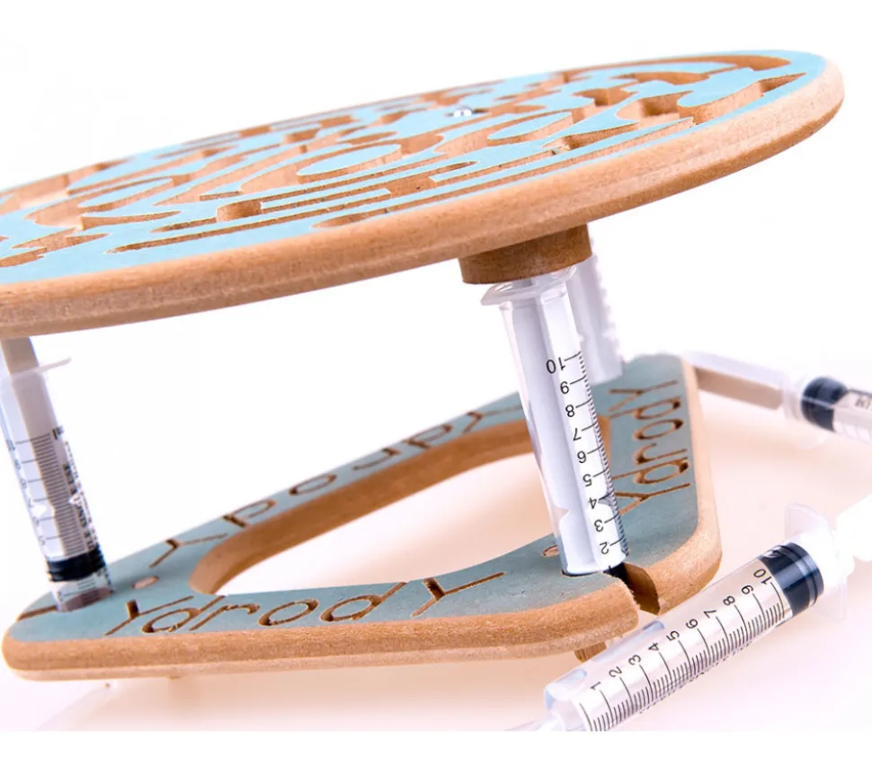 Remplir 3 seringues avec de l’eau et les raccorder aux tuyaux reliés avec 3 seringues vides. Placer 3 seringues sur le support, poser le plateau sur les seringues. Le jeu est prêt ! Il suffit d’actionner les seringues, l’eau fera bouger le plateau et la bille se déplacera.